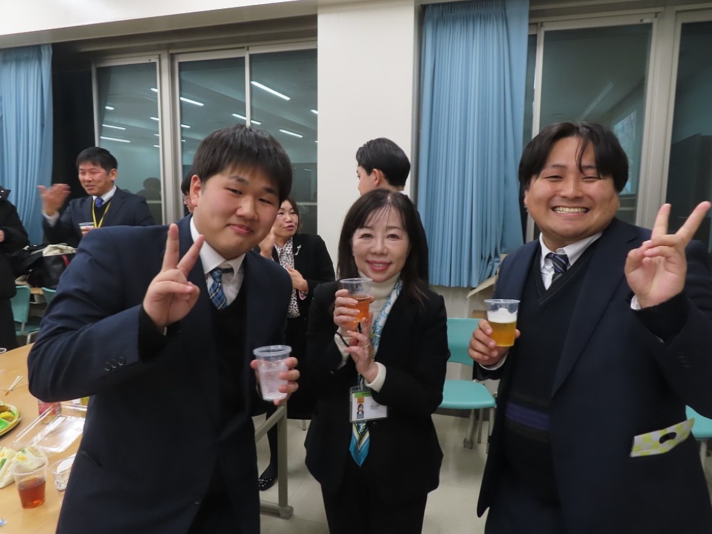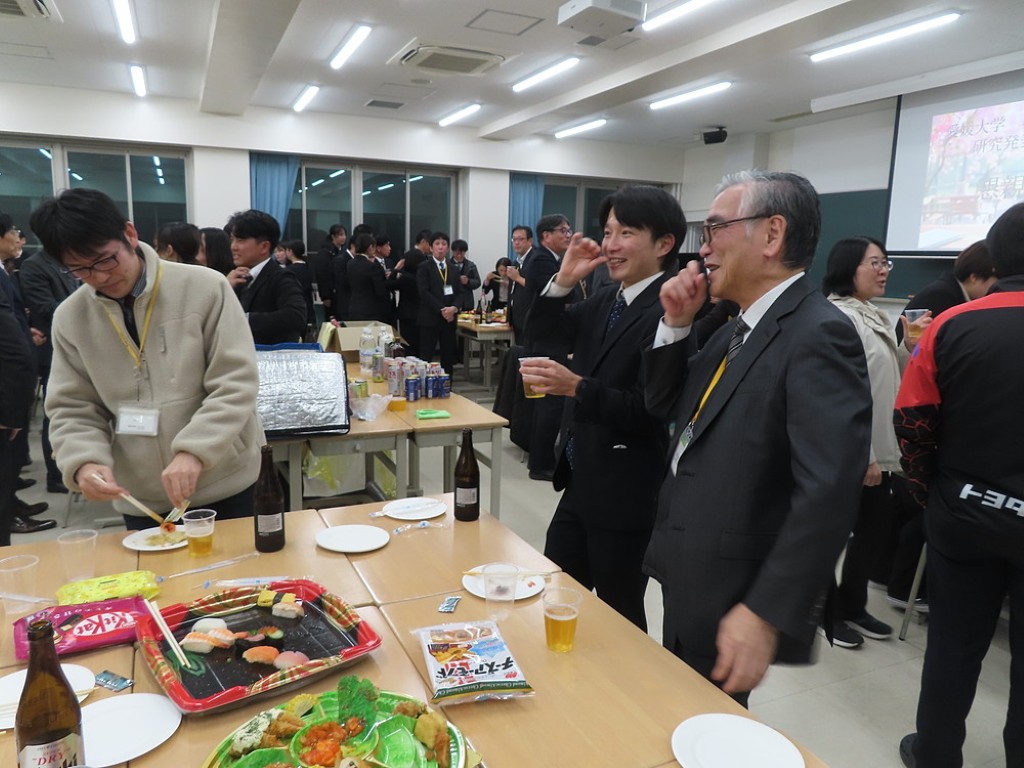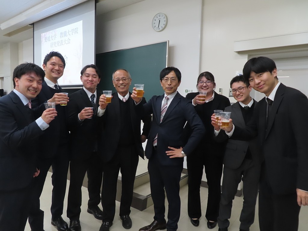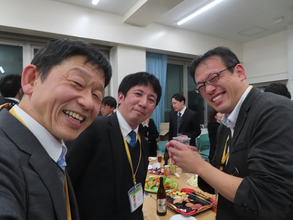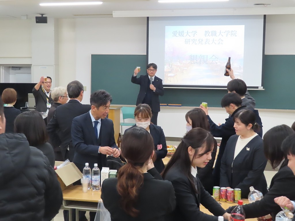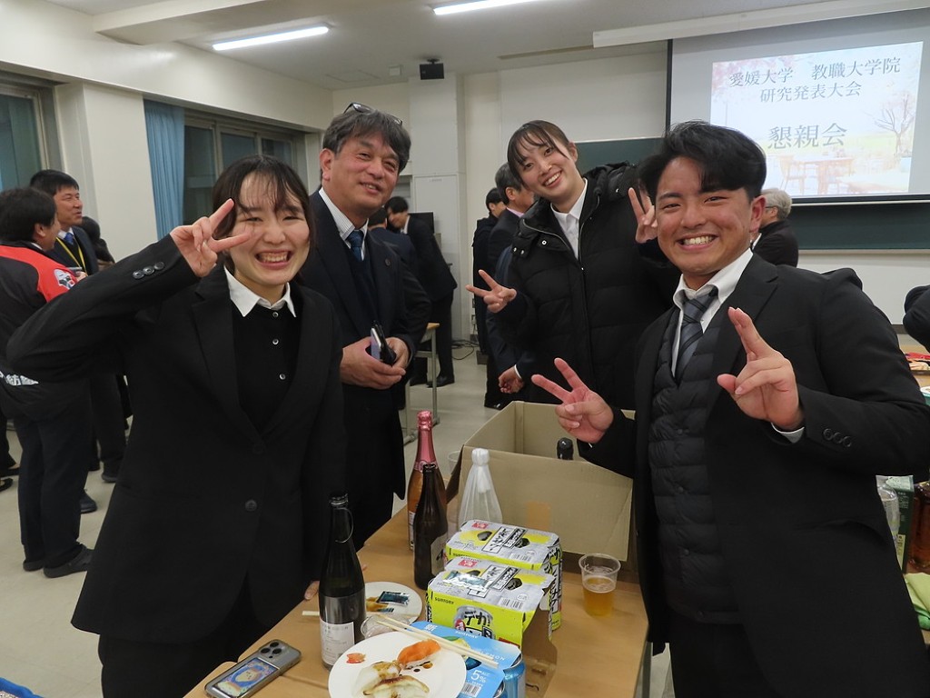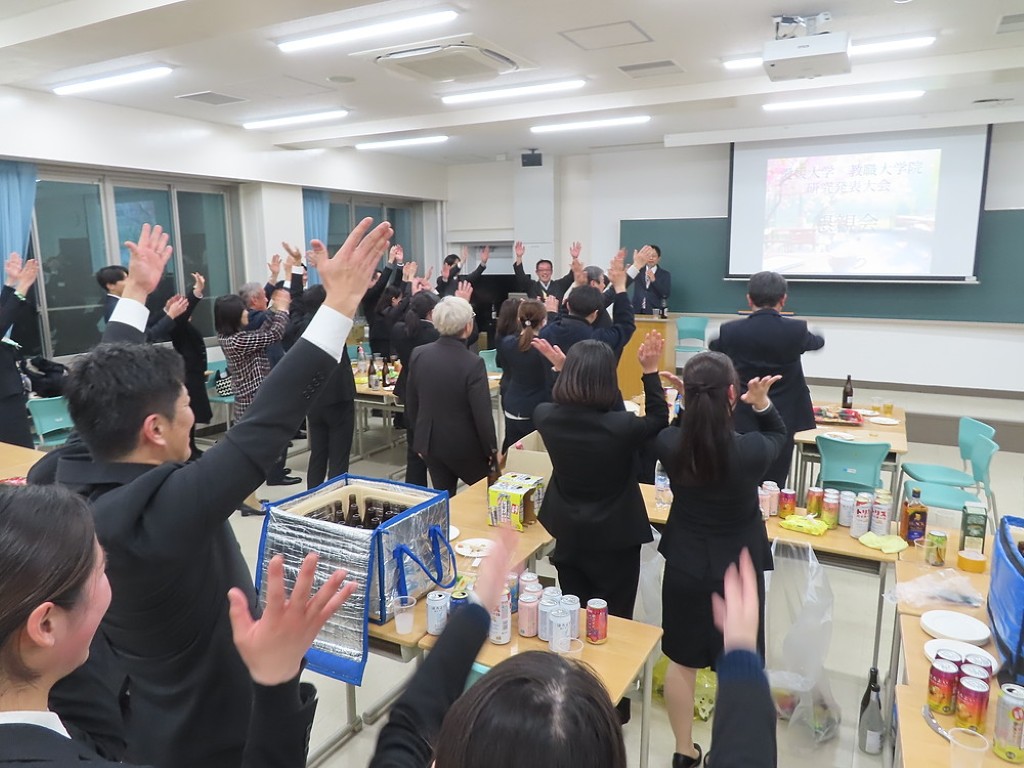 アルムナイ総会の後の懇親会では先生方と現役の院生、卒院生、皆、和やかに、和気藹々とした雰囲気で、大学院の思い出話や研究大会の反省などの話に花が咲きました。研究発表会の緊張感から解き放たれて、皆、とってもいい笑顔ですね。最後は恒例となった、専攻長による万歳三唱で、会を締めました。気合いの入った力のこもった「万歳!」の言葉に教職大学院の力強い未来を感じました。