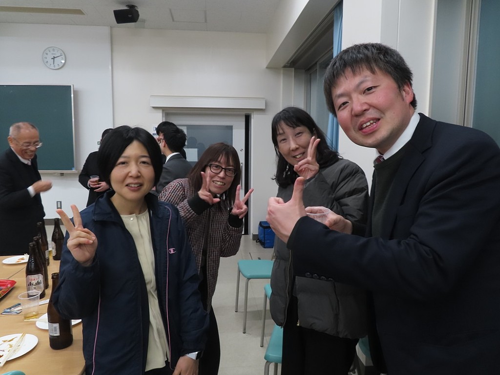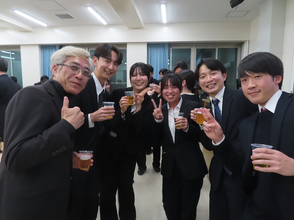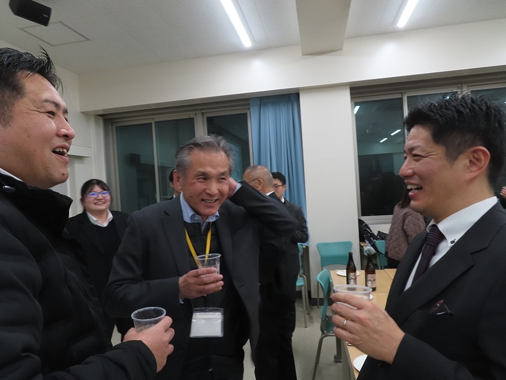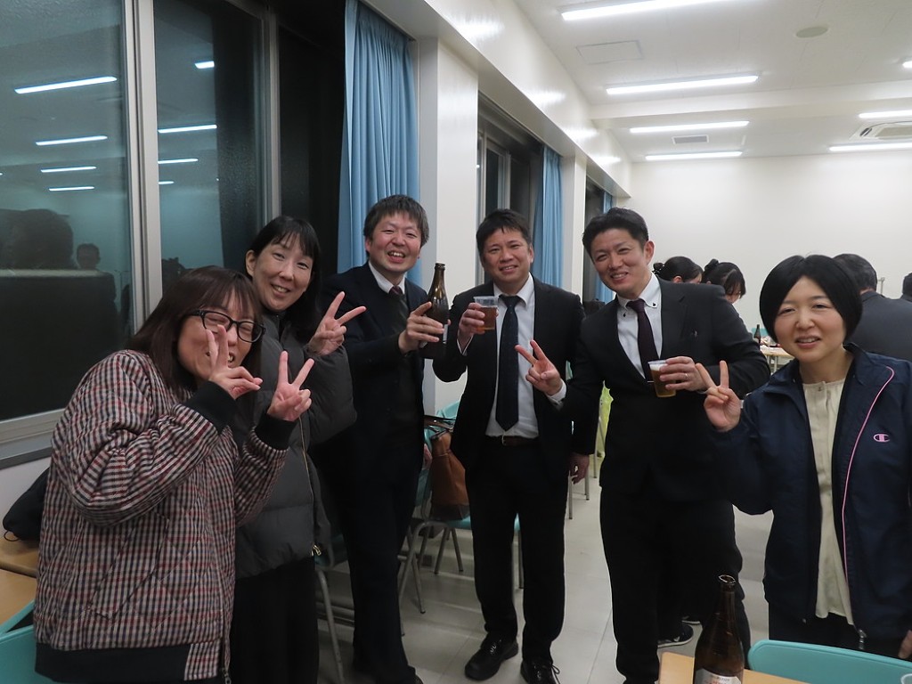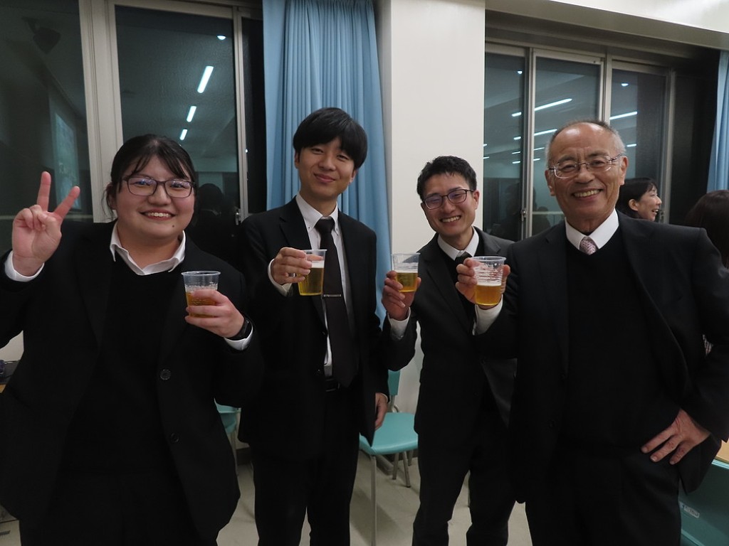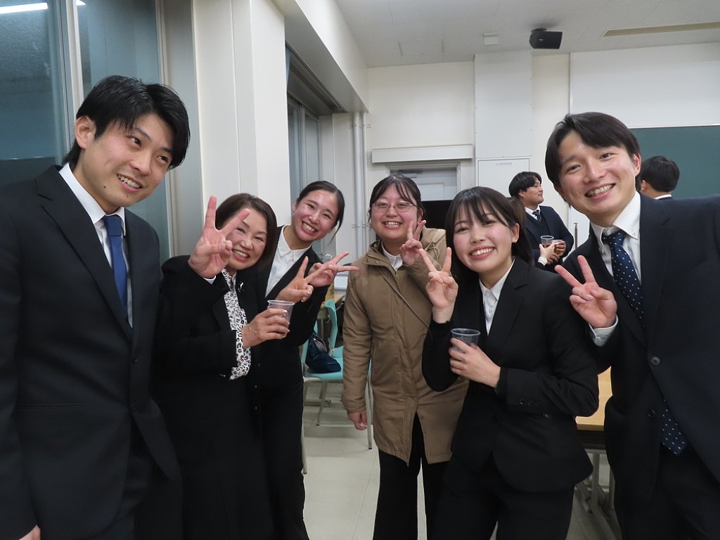 アルムナイ総会の後の懇親会では先生方と現役の院生、卒院生、皆、和やかに、和気藹々とした雰囲気で、大学院の思い出話や研究大会の反省などの話に花が咲きました。研究発表会の緊張感から解き放たれて、皆、とってもいい笑顔ですね。最後は恒例となった、専攻長による万歳三唱で、会を締めました。気合いの入った力のこもった「万歳!」の言葉に教職大学院の力強い未来を感じました。