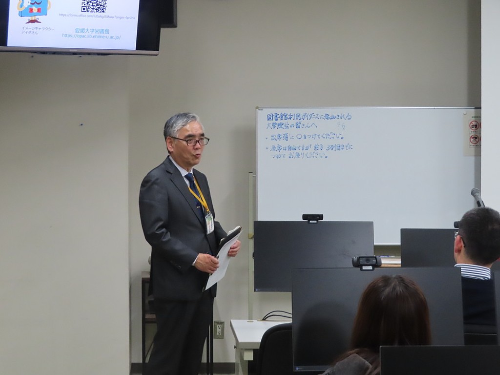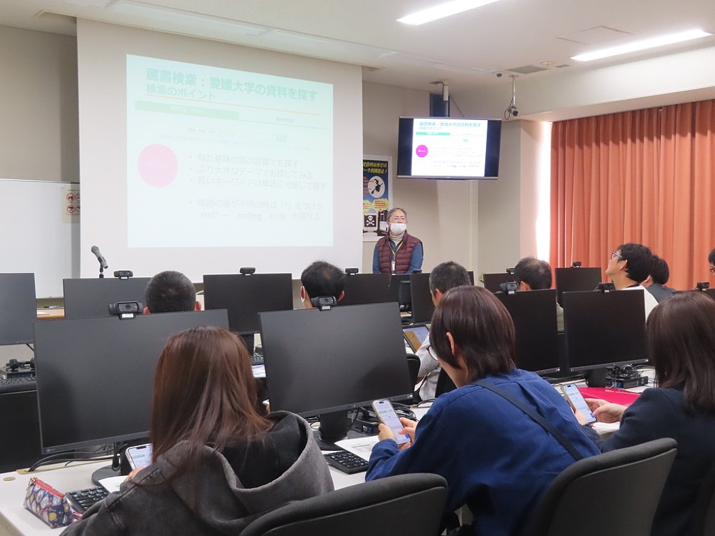 愛媛大学図書館の担当者から、図書館利用についてのガイダンスをしていただきました。