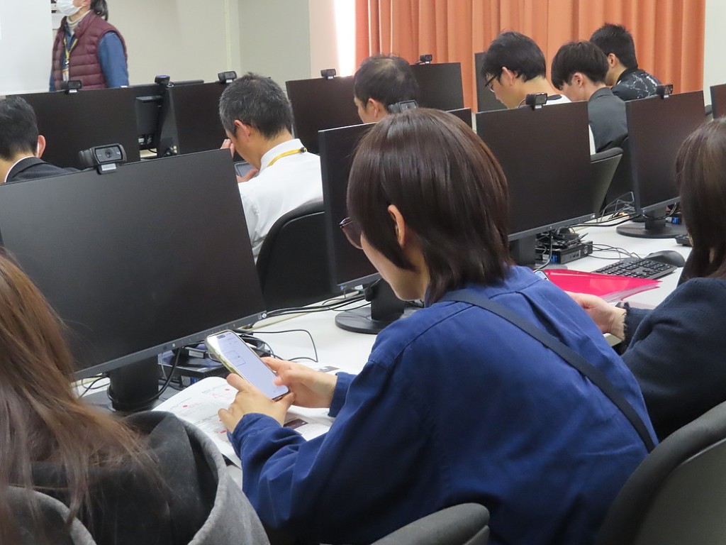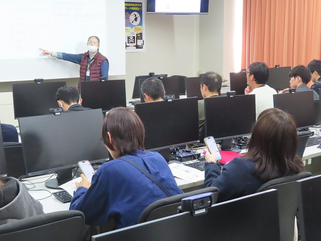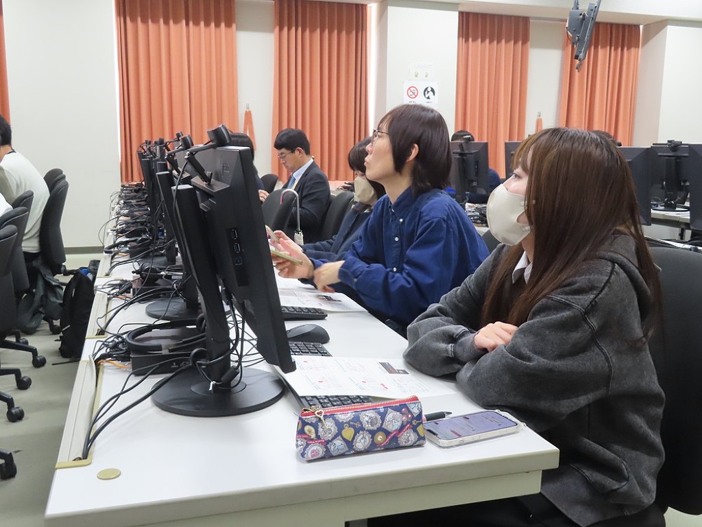 大学図書館のWebサービスを使うと、大学が所蔵している書籍もとより、強力なネットワークを生かして、全国の様々な書籍や論文、雑誌、新聞等の情報をすぐに手に入れることができます。講師の先生の話を聞きながら、学生たちは自分のスマホ等を使って、それらの検索する方法を学びました。